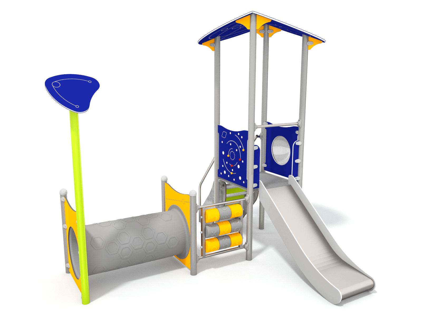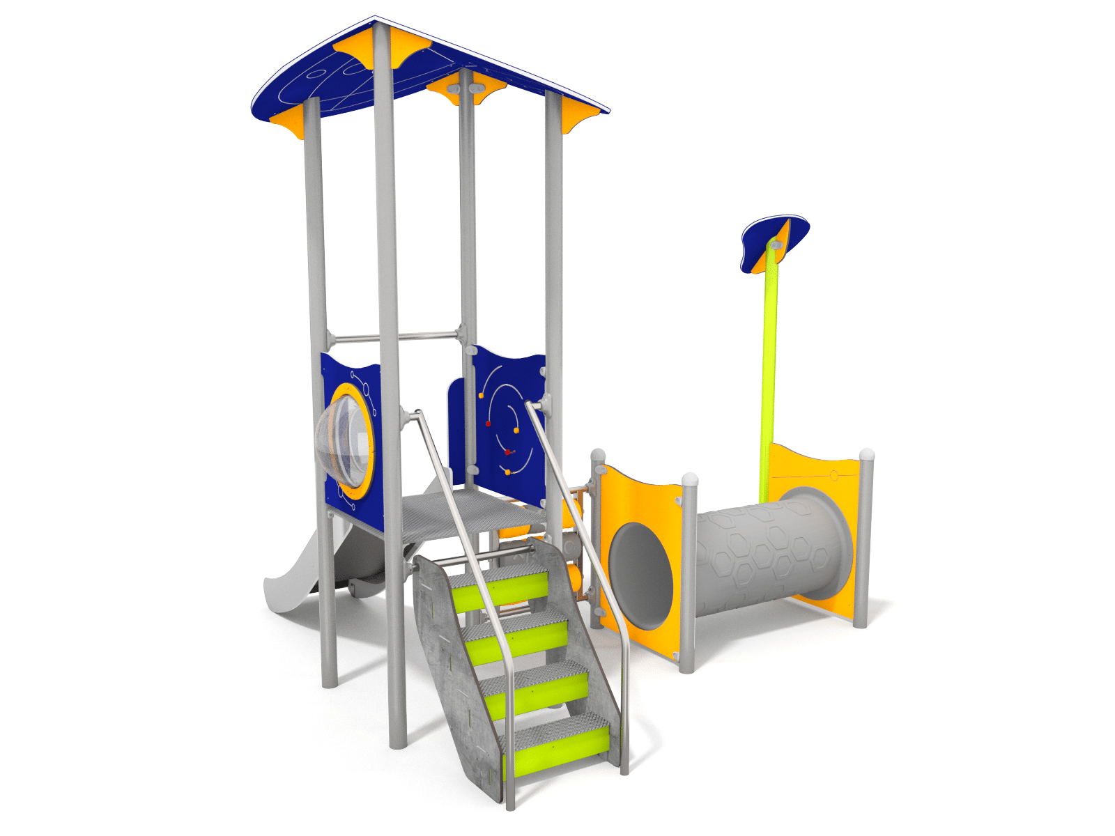 Kombinasjonsapparat med plattform med tak, trapp og sklie, kryptunnel og spil- og aktivitetspaneler.