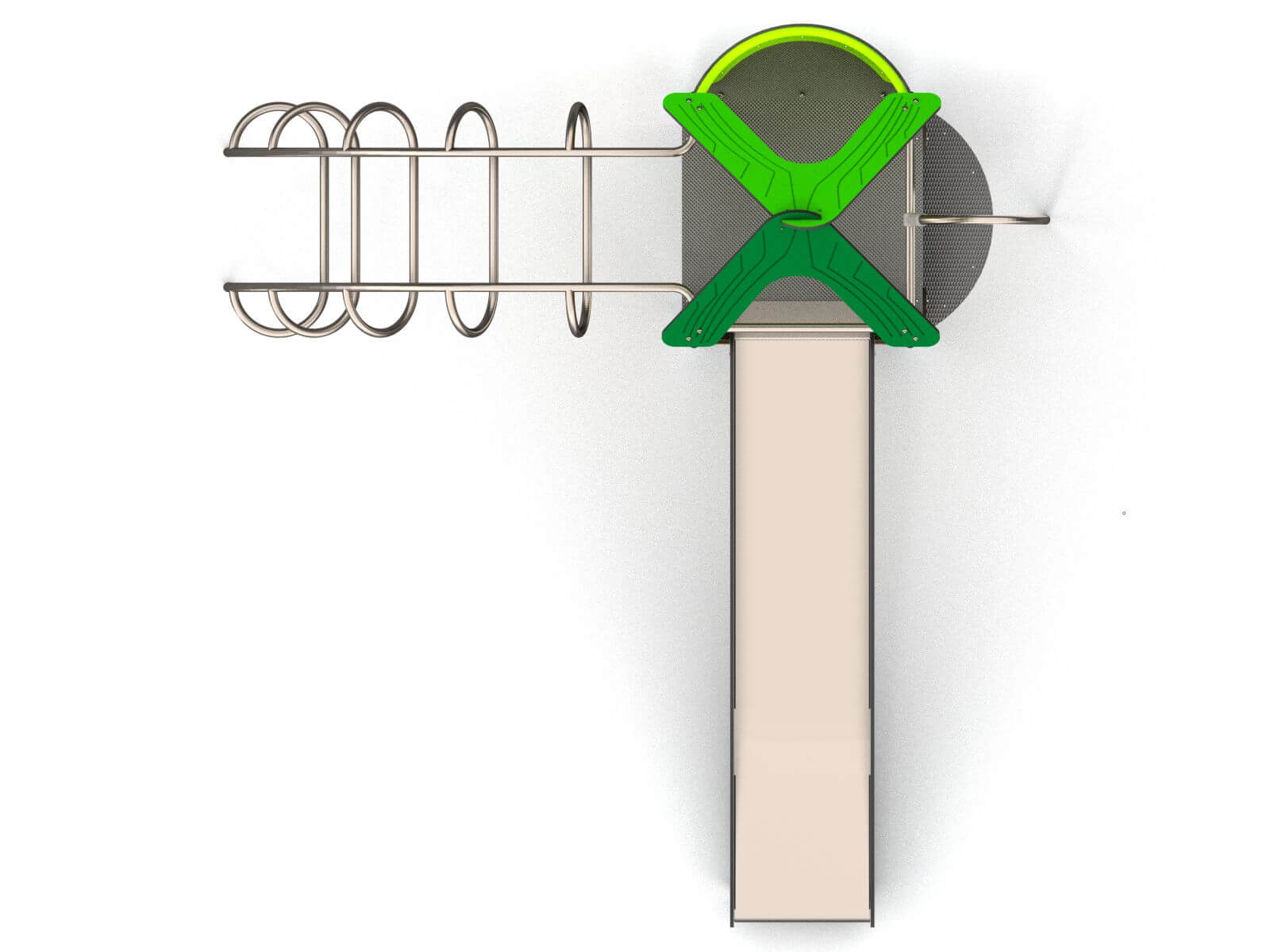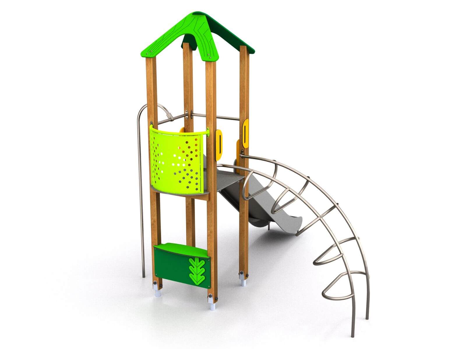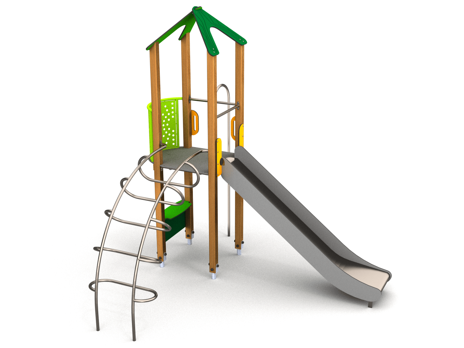 Kombinasjonsapparat med rutsjebane, plattform med tak, stige, brannmannstang og handledisk.