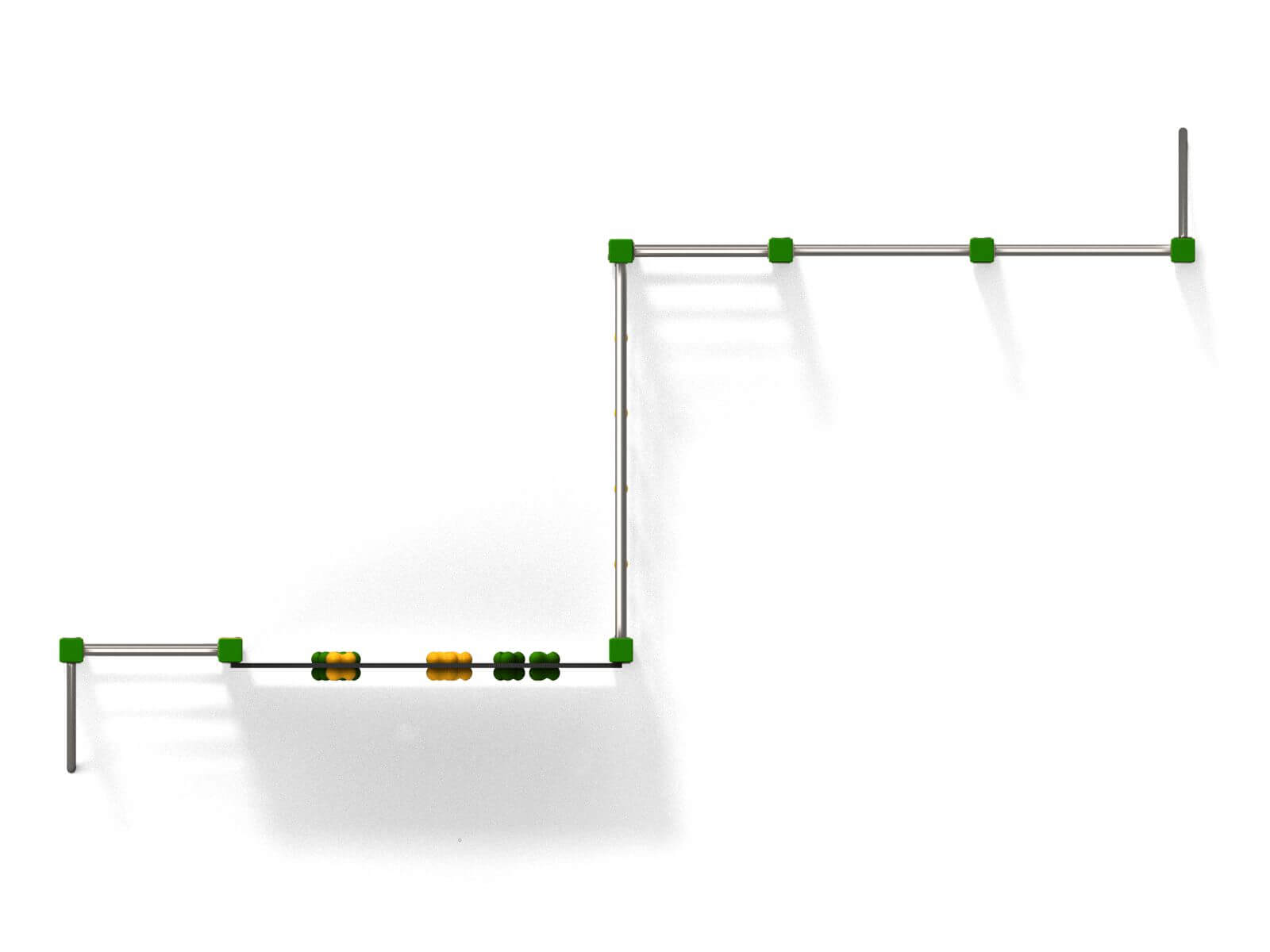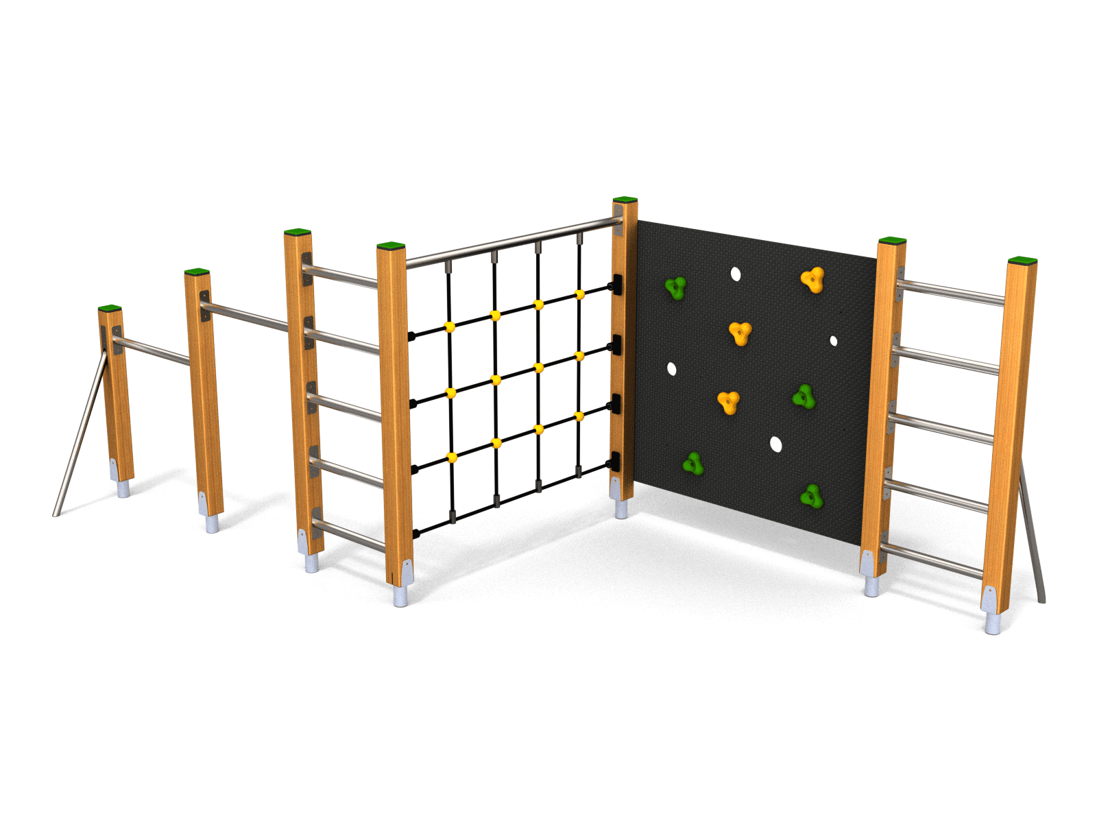 Klatreapparat med dobbel svingstang, stige, klatrenett og klatrevegg.